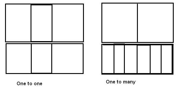 The MBFGE link-scheme is based on the non-overlapping approach. It means, that a cell at the linked boundary of a domain can be linked only either to one cell (link 'one-to-one'), or to the whole number of cells from the other domain (link 'one-to-many'). There is no limit on the number of cells connected to one cell; it could be 1-to-5, 1-to-17, etc.. However, the type of connections should be uniform across the linked surfaces of domains.