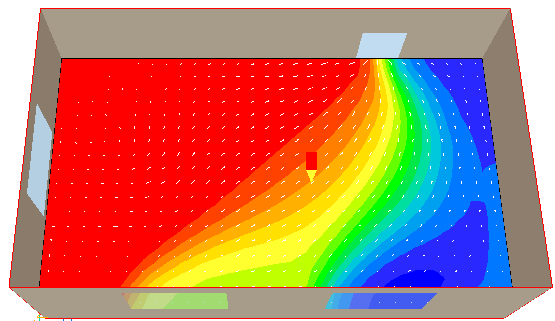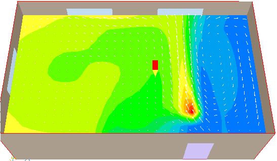 On the west side there is an inlet and on the north and east sides are outlets. The south side is a wall with constant temperature. In the south-west corner of the domain area there is a point source of pollutant..