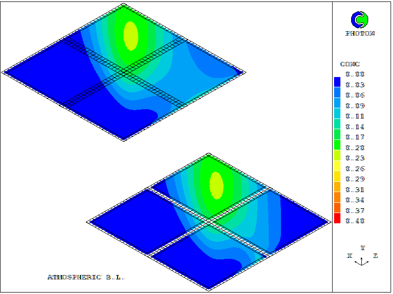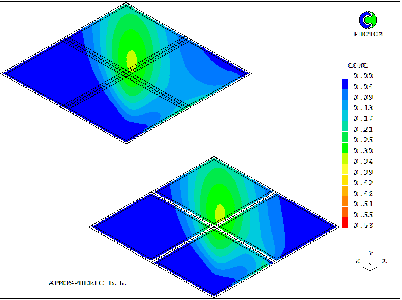 This example, which is case 858 of the core Input-File Library, explores distribution of pollutant over a large territory. Use of transfer objects permits to calculate uni-directional flow on small parts by one for other. The researched area according to the domain-partitioning technique in this case is divided on four parts as is submitted below.