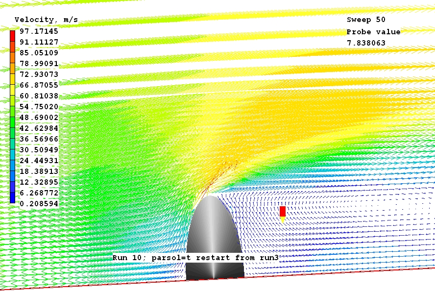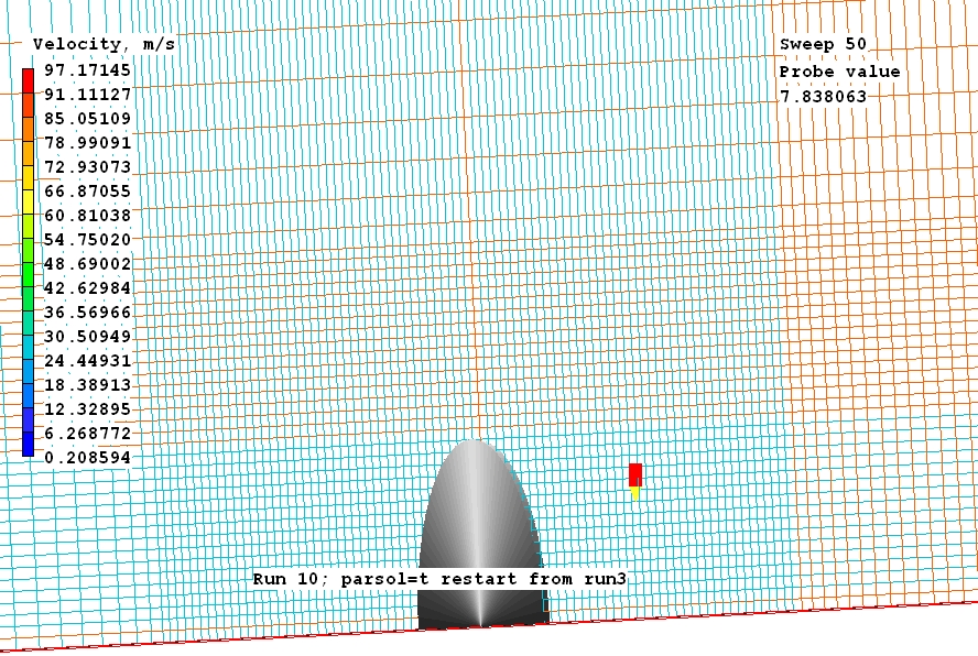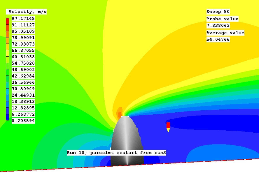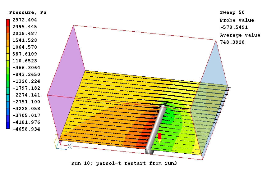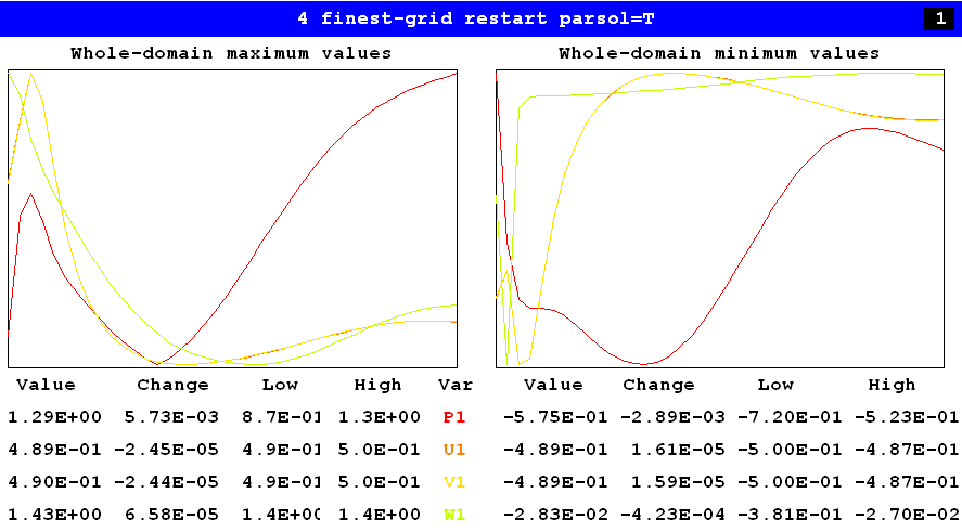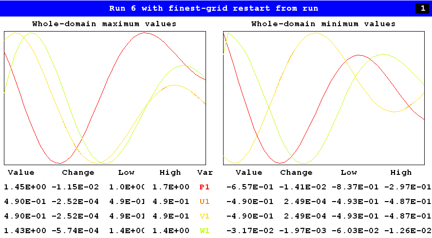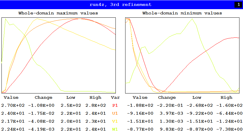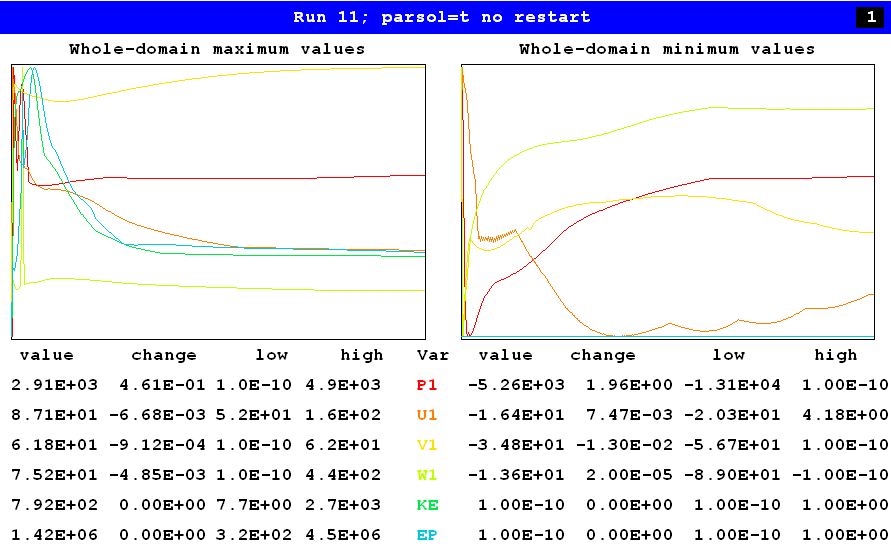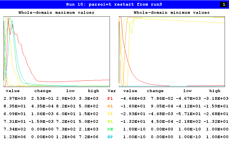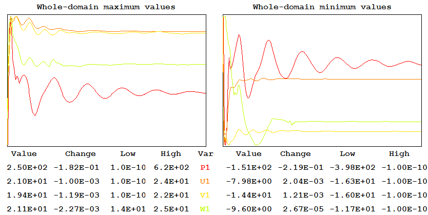 The left-hand box shows that the maximum pressure (red curve), for example, has varied between 2.9E3 and 3.3E3 pascals during the run, and has become 2.97E3 at its end.It has not quite stopped varying; but its change in the last sweep was 2.53E-1 pascals, i.e. less that 0.01 % of the absolute value.