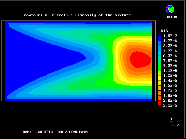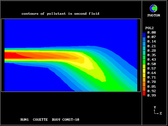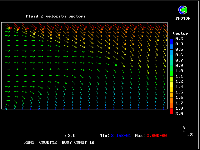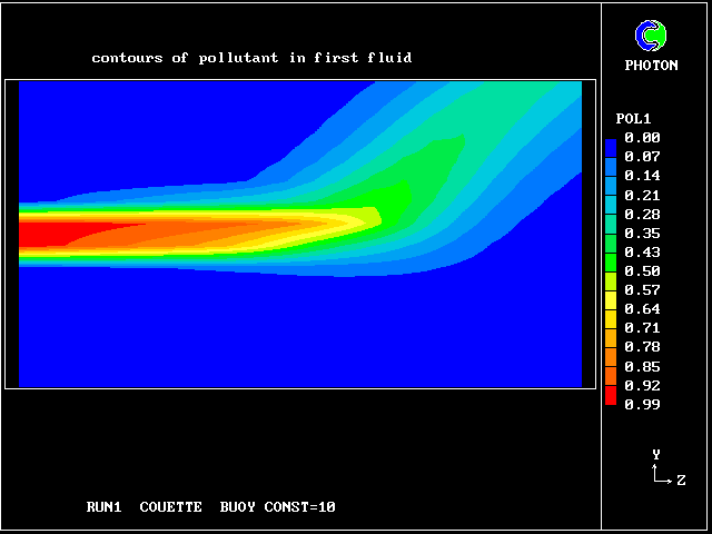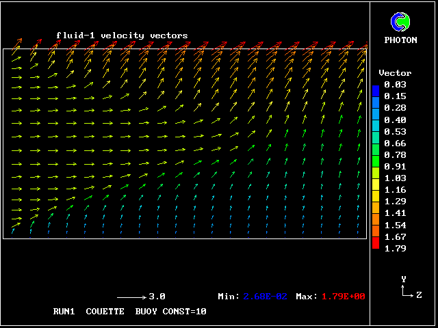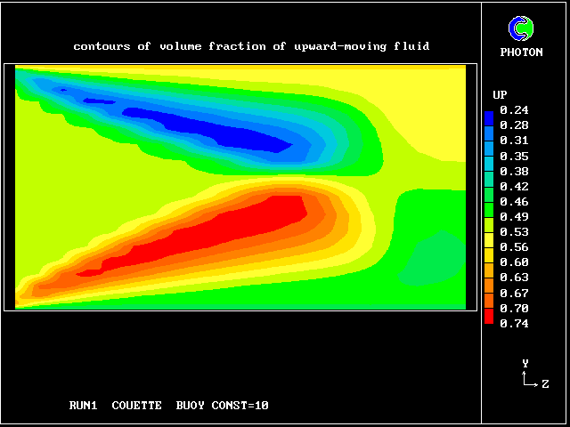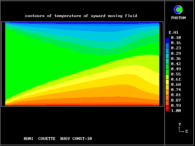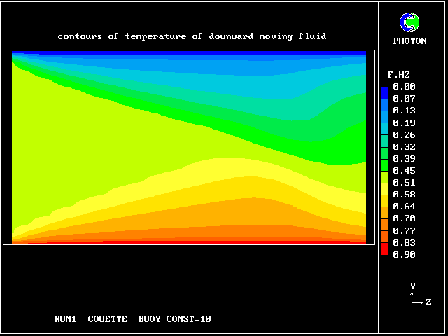 Some line-printer output from the PHOENICS library case W975 now follows; this concerns flow between a hot surface at rest and an upper cold moving surface. This is a Couette-flow idealization of an unstable atmosphere.