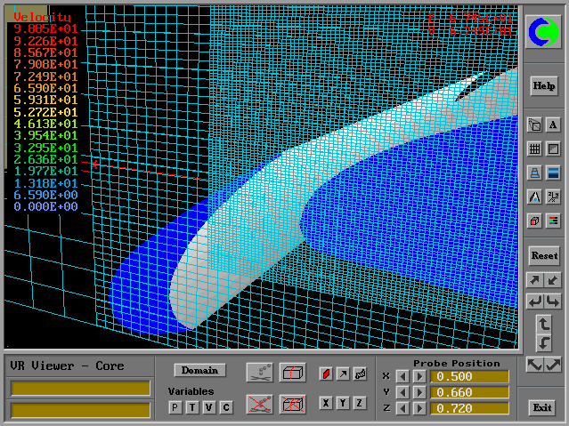 Fig. 2.1-2 shows some of the results of the flow simulation corresponding to the data-input specification of Fig. 2.1-1. The VR-viewer is capable of showing vectors, streamlines, contours and iso-surfaces.