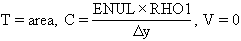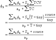 Numerical practice: a fixed source can be put into the equation by setting C to a small number, so that the denominator is not changed, and by setting V to (source/C). T then ensures that the final source is per cell.