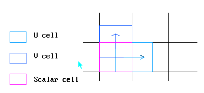 Vector quantities are computed by reference to cells which are staggered with respect to the scalar cells.