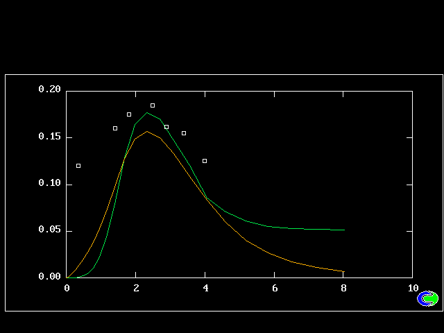 In Fig.3 and Fig.4 the results of numerical computations are compared with experimental measurements of concentration fluctuations extracted from the work of Elgobashi et all (1977): green lines - MFM predictions, yellow lines - transport equation for the root-mean-square fluctuation. The points are either the experiments of Torrest and Ranz for Craya-Curtet number 0.875, Fig.3, or of Becker, Hottel and Williams for Craya-Curtet number 0.345, Fig. 4.