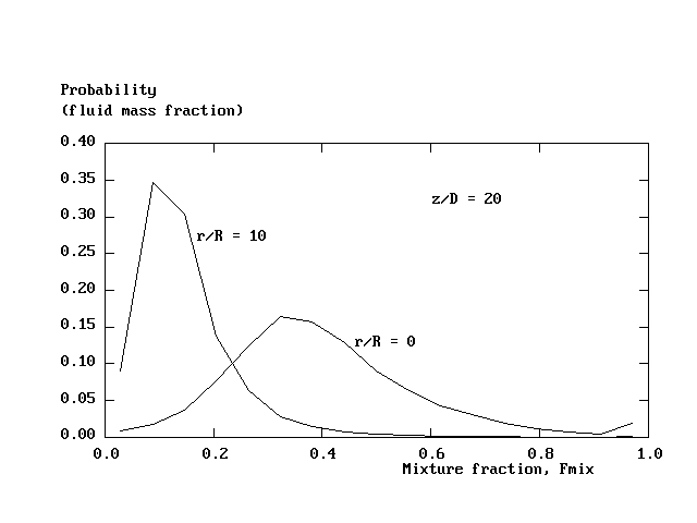 Figure 8. The fluid population distribution, "Probability Density Function" at two locations in the flame.