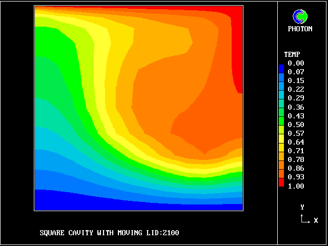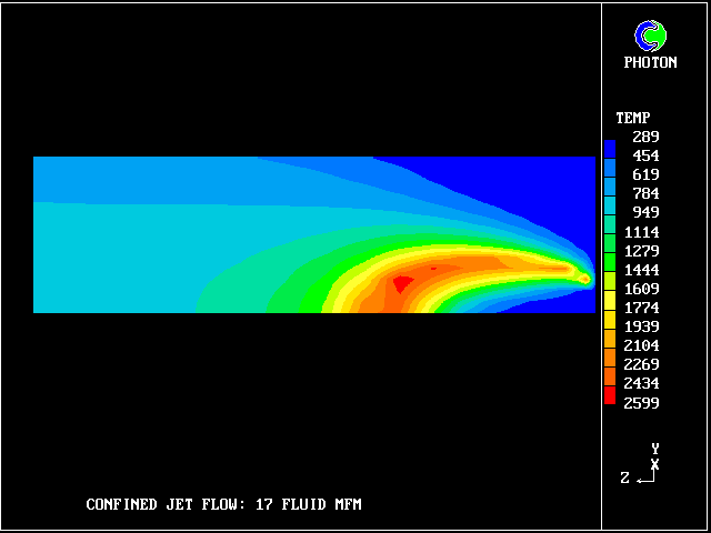 The bottom picture of the panel shows the distribution of temperature ( red - 2478 K, blue - 378 K ).