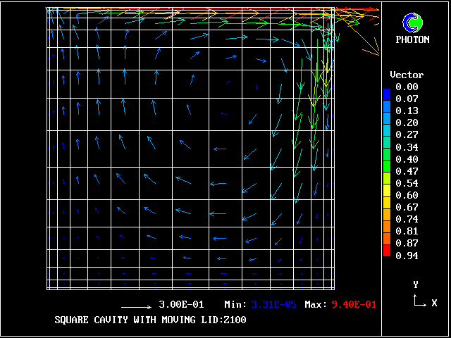This run analyses the flow in a cavity, the top wall of which moves with a constant velocity.