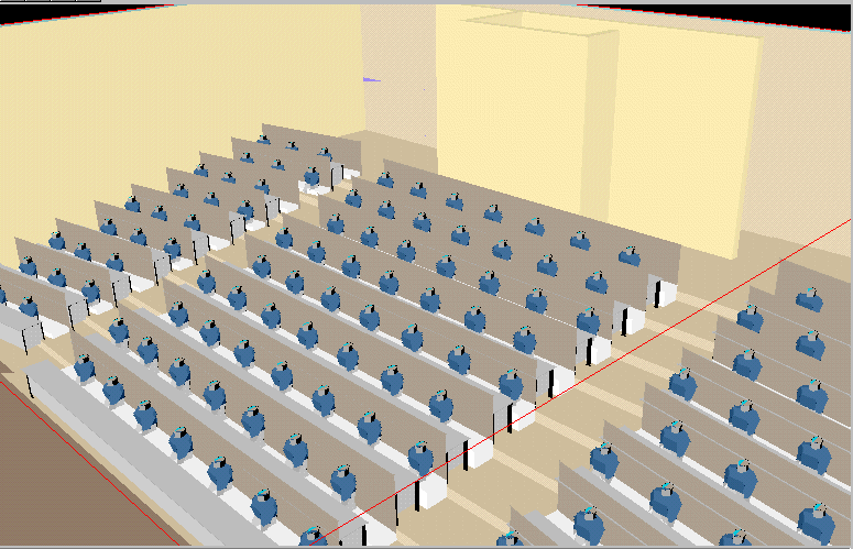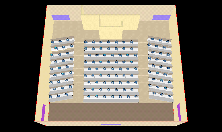 The lecture theatre modelled consists of series of seats row, a projection room at the back and a stage at the front. Its dimensions are: 18 metres by 16 metres by 6 metres high. Up to 275 persons can be seated in this lecture theatre.