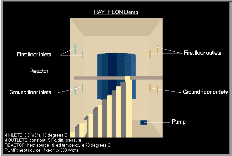 Each inlet injects into the room 0.5 m3/s at 15 degrees C. Each of the four outlets maintains a constant 15 Pa differential pressure. The temperature of the reactor is fixed to 70 degrees C. Finally, the pump releases a heat of 500 Watts to the room.