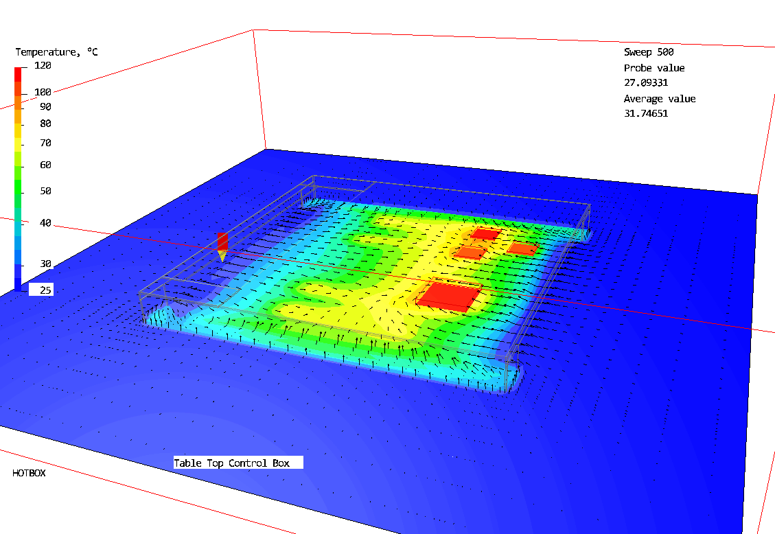 This case represents a table top electronic box / control box. It consists of several heating components mounted on a printed circuit board with a steel base plate and a plastic cover. Natural convection is the cooling method with air passing through vents in the base, sides and top. Here, z-direction is aligned with gravity. This time the flow is treated as laminar and no radiation is included. The domain is enlarged so that the calculation boundaries are far away from the box and their effects on the results can be ignored.