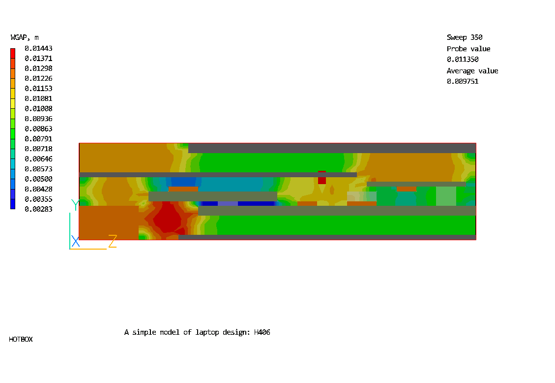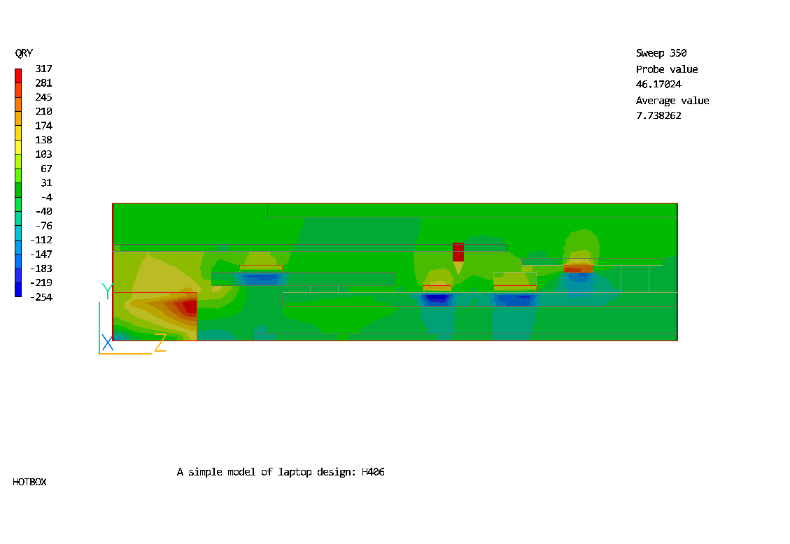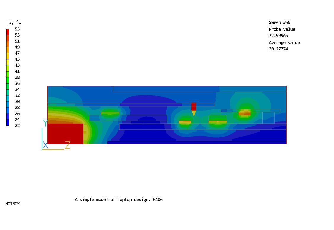 The flow and temperature distributions in the simplified portable laptop unit are predicted in this case.