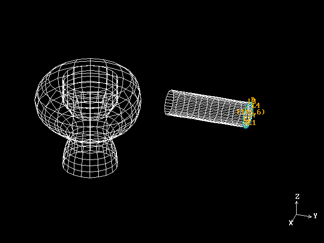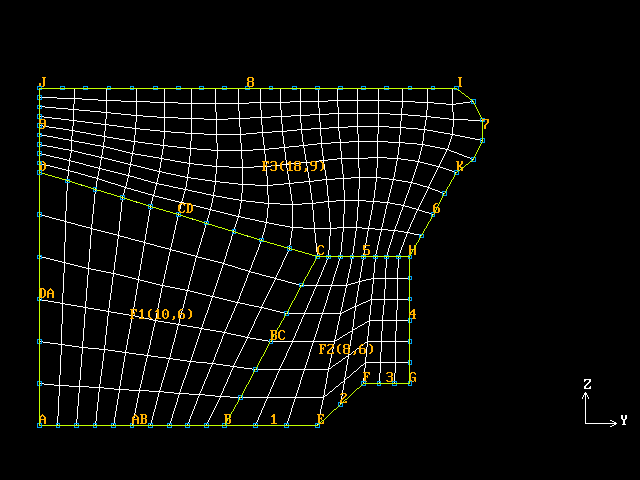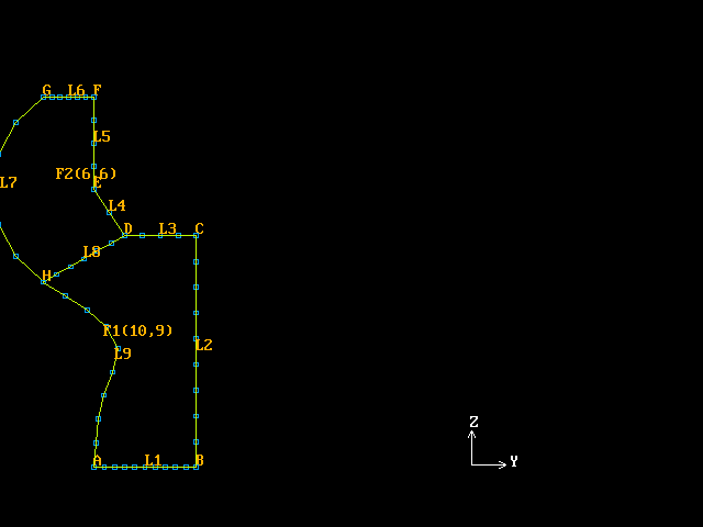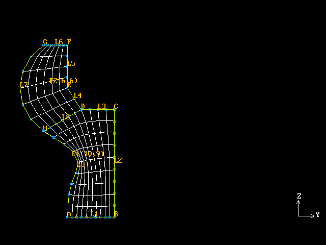REAL(PI,DD,RR,AN,Z1,Y1,Y2);PI=3.14159;DD=0.5;RR=0.2;AN=40 AN=AN*PI/180. Z1=RR*SIN(AN);Y1=DD*TAN(AN)-RR/COS(AN)+RR*COS(AN) Y2=DD*TAN(AN)-RR/COS(AN)+RR BFC=T GSET(P,A,0,0,-1);GSET(P,B,0,0,1);GSET(P,C,0,1,1);GSET(P,D,0,1,-1) GSET(P,E1,0,0,-DD);GSET(P,E2,0,Y1,-Z1) GSET(P,E3,0,Y1,Z1);GSET(P,E4,0,0,DD) GSET(L,A1,A,E1,4);GSET(L,12,E1,E2,4) GSET(L,23,E2,E3,4,ARC,0,Y2,0) GSET(L,34,E3,E4,4);GSET(L,4B,E4,B,4) GSET(L,BC,B,C,10);GSET(L,CD,C,D,20) GSET(L,DA,D,A,10) GSET(F,F1,A,E1.E2.E3.E4,B,- GSET(M,F1,+K+J,1,1,1,LAP30.FFFTFF) GSET(C,I2,F,I1,+,.1,0,0);GSET(I)