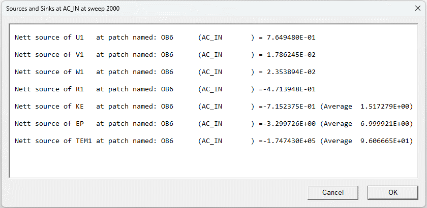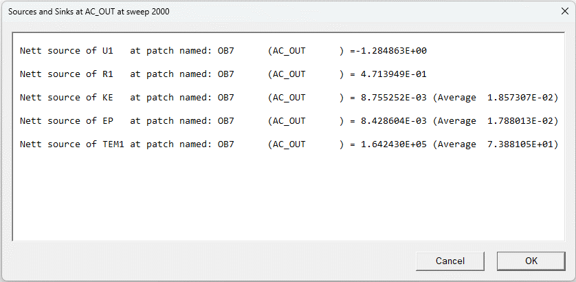The mass flows (Nett source of R1, in kg/s) are equal and opposite, as expected. The energy sources (Nett source of TEM1 in W) are also opposite and the source at AC_OUT is 10500W lower, as expected. The average temperature (shown in brackets after 'Average') is lower at AC_OUT.