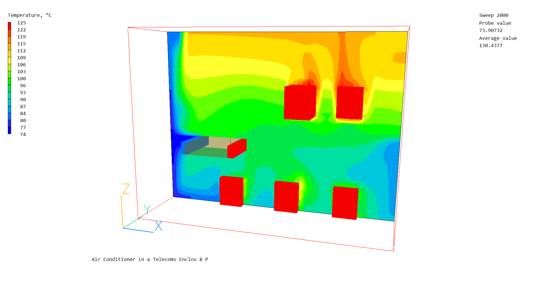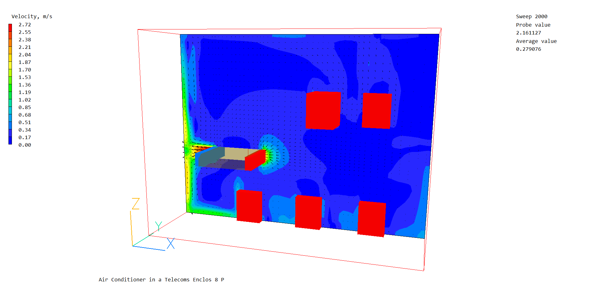 Before running the solver, it is a good idea to place the probe in a suitable place to monitor the convergence of the solution. Too close to an inlet, and the value will settle down very quickly before the rest of the solution. Placed in a recirculation zone, it may still show traces of change even though the bulk solution is converged. In this case, between the air-conditioner output and the wall is fine.