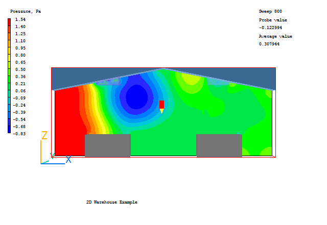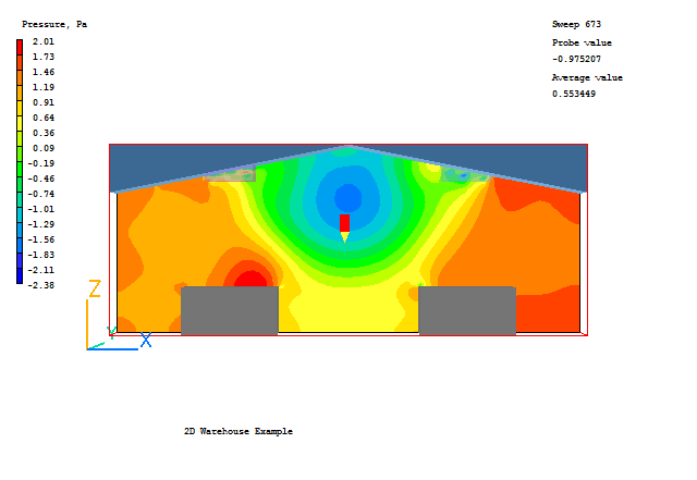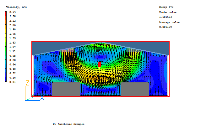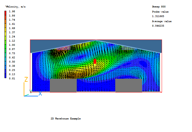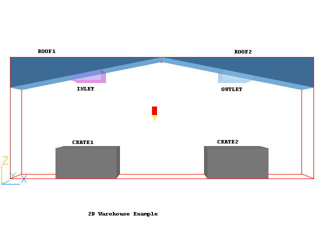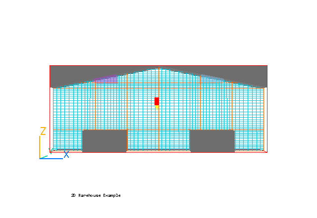 The example is a 2-dimensional section of a warehouse. The fluid is air and the flow is turbulent and isothermal.