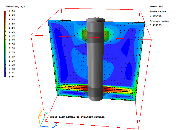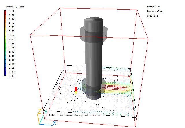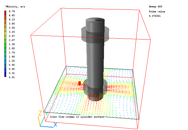 In the run just made, the inflow condition was set to 5.0m/s normal to the surface of the underlying blockage. Another option is to set the cartesian components of the inflow vector.