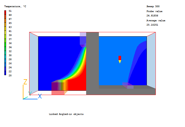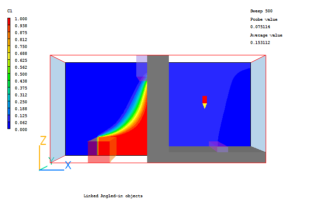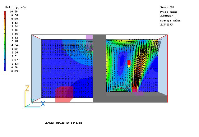 Before running the solver,it is a good idea to place the probe in a suitable place to monitor the convergence of the solution. Too close to an inlet, and the value will settle down very quickly before the rest of the solution. Placed in a recirculation zone, it may still show traces of change even though the bulk solution is converged. In this case, somewhere in the middle of the right-hand airspace is fine. This will let us see if any flow is getting through from the other side of BLOCK-1.