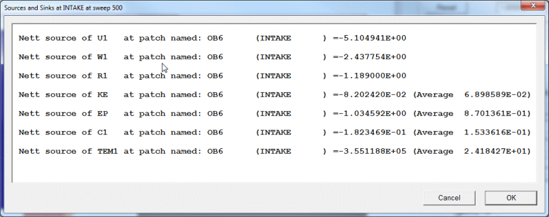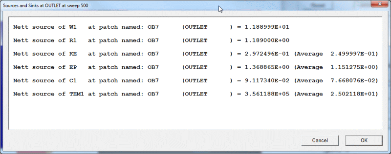 The mass flows (Nett source of R1, in kg/s) are equal and opposite, as expected. The energy sources (Nett source of TEM1 in W) are also opposite and the source at OUTLET is 1000W greater. The average temperature is slightly higher.