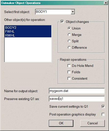 Tick 'Object changes' and then 'Union'. From the 'Other object(s)' list (or the screen) select BODY2, FWHL and RWHL. Un-tick 'Do hole mend' as we do not need to do any repairs. The screen should look like this: