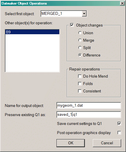 The repaired geometry will be called 'mygeom.dat', and a copy of the Q1 containing the model in its current (pre-repair) state will be saved to 'saved.q1'. Both these names can be changed if required. The saved q1 can be used to recover the model should something go very wrong with the repair.