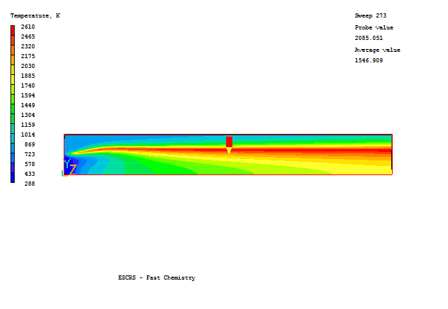 The image below shows the temperature distribution for option 1, fast chemistry.