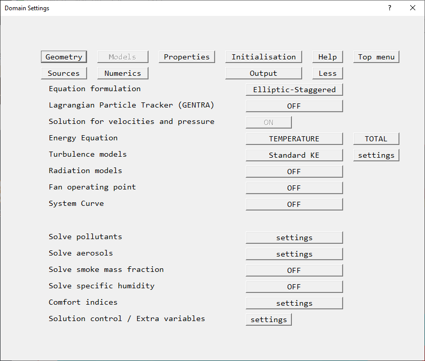 - The domain is filled with air, and ideal gas law was used in calculating pressure-temperature-density relationships. The roof, floors and walls were modelled using an adiabatic solid material.