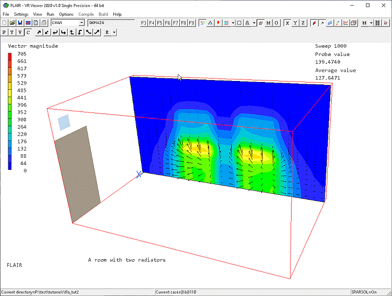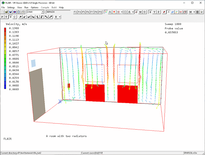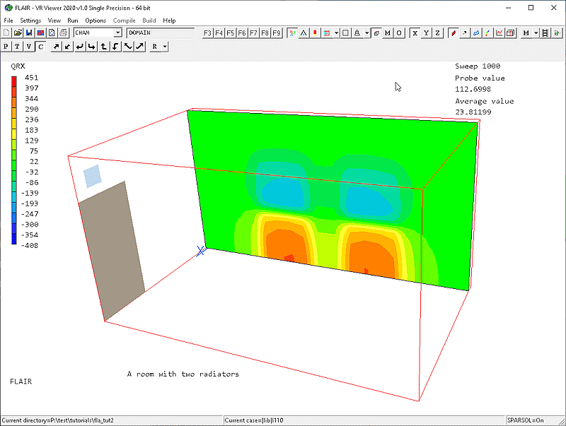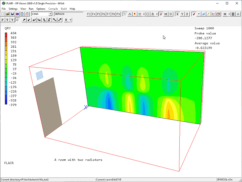 The radiators underneath each window produce a heat flux of 500W each and the walls are