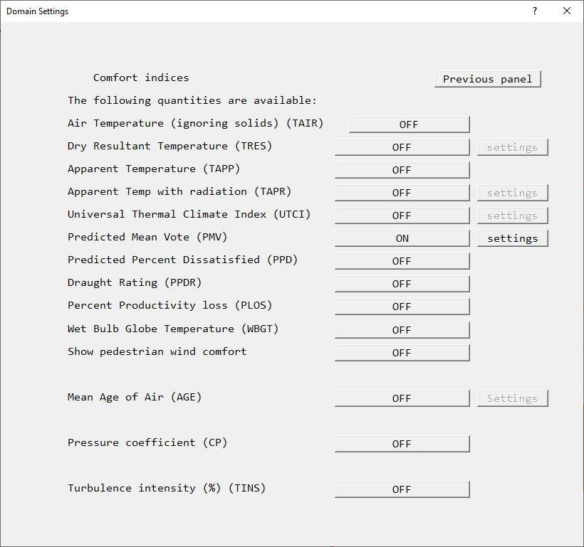 - Switch on ' Predicted Mean Vote' (PMV) as shown below. Click 'Settings' and set Radiant temperature to Solved.