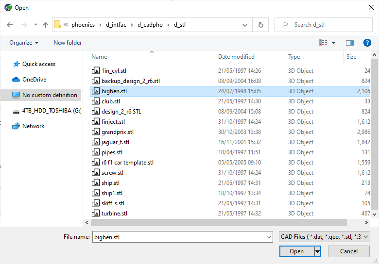 - Locate the bigben.stl in the directory /phoenics/d_intfac/d_cadpho/d_stl as shown below