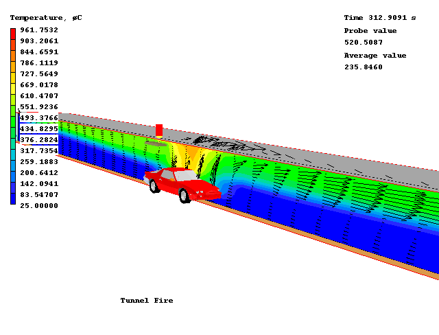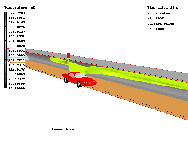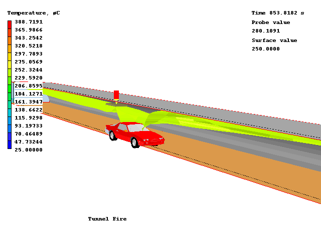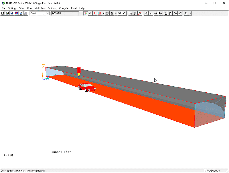 This example shows how to set a time varying heat source using In-Form. The case calculates the flow resulting from a car fire in a short tunnel. Note that in FLAIR, the heat source set here can be put in as a piece-wise linear source for a FIRE object without the need to use InForm.