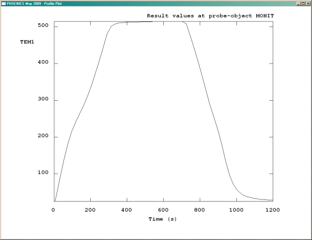 Figure 6 shows the time-history of temperature at the Point_history object MONIT. To get this image, select the MONIT object, right-click and select 'Show results'. Select TEM1 from the list of variables.