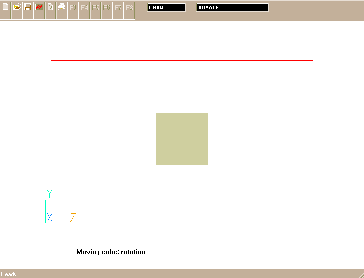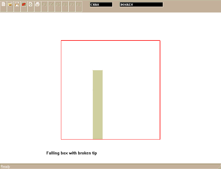 The movement of the first object, called BLOCK, starts from its stationary position as a vertical wall with its base placed next to the middle of the bottom domain boundary. BLOCK is allowed to fall. It does so by rotating clockwise about X-axis of its south-high corner. The angular velocity of the fall is 75 degrees per second.