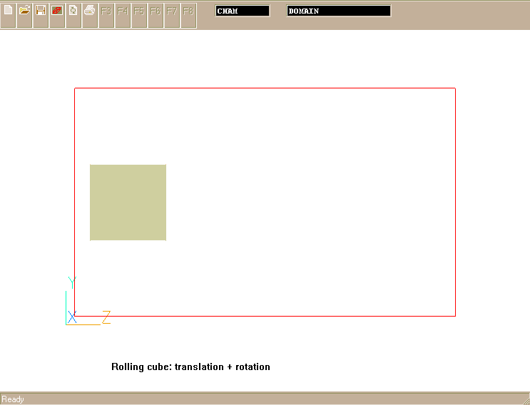 The case exemplifies the specification of the attributes for composite movement: the translation of rotating block. It results in the effect of the rolling 2D rectangular object with the longitudinal (Z-direction) velocity component of 3 m/s and the angular rotation about block centre line (X-axis) of 30 rpm. The movement starts from the initially steady position defined in the Q1 file.