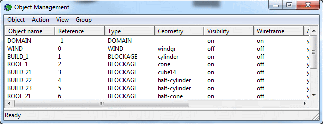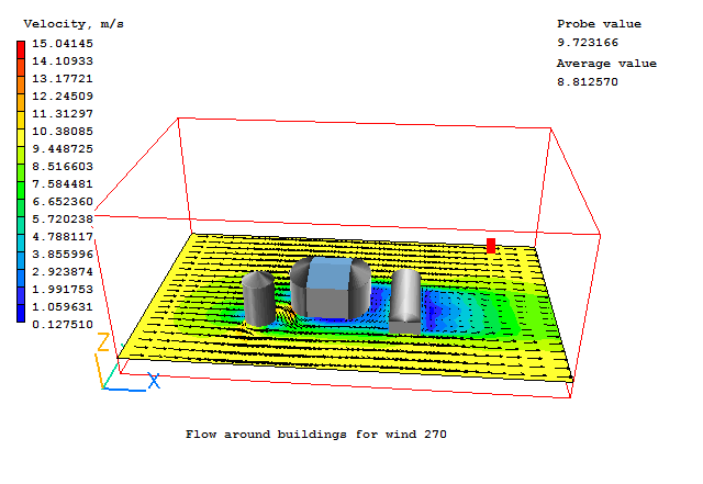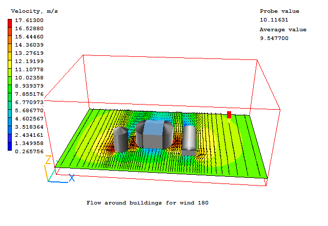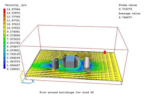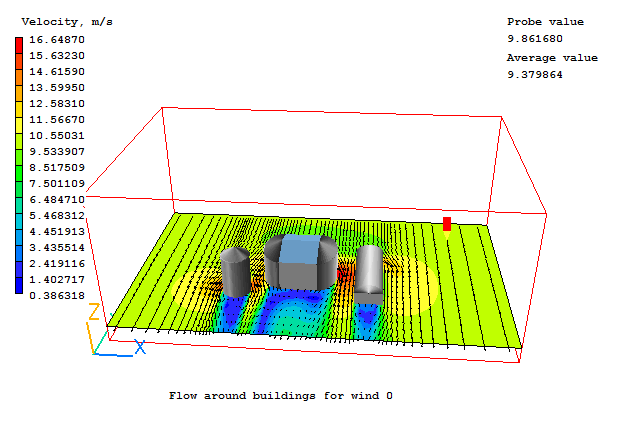 The air flow past the buildings is controlled by a WIND object. In the library case (and tutorial), the wind is set to blow from the South-West.
