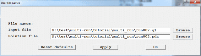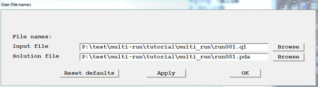 On the file names dialog toggle 'No' next to 'User-set file names' to 'Yes', then click 'Select files'. Click 'Browse' next to Q1, and select multi_run\run001.q1, then click 'Open'. The names of other required files will automatically update to be consistent with the chosen Q1.