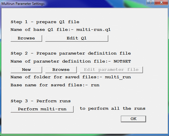 The name of the base Q1 file was already set to 'multi-run' when you saved the case. Click 'Edit Q1' to open the selected file editor (PQ1 Editor or Notepad).