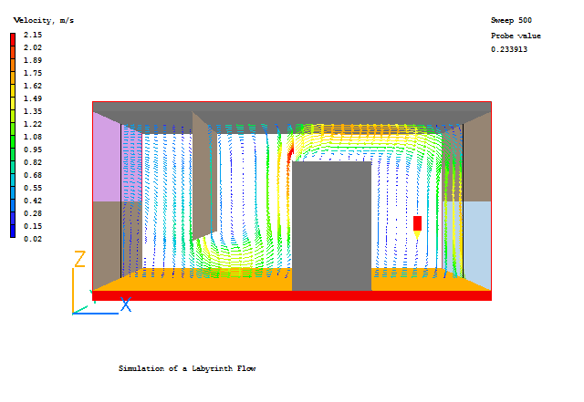 An earlier example set up a 2-dimensional labyrinth flow. The fluid was air and the flow was turbulent with heat exchange.