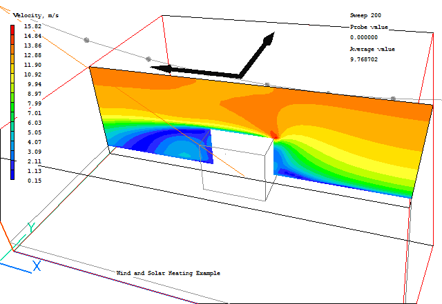 The wind is blowing from the East (indicated by the red arrow) with a reference velocity of 10 m/s at 10m above the ground. The ground roughness height is 0.1m, suitable for low crops, occasional large obstacles. The external pressure is 1 atmosphere (1.01325bar) and the air temperature is 20C. The temperature of the earth is 10C, and the sky 0C. The date is 1st June, and the time of day is 15:00hrs (3pm). The latitude is 51N - around London, UK. The direct solar radiation is 500W/m2, and the diffuse radiation is 100W/m2.