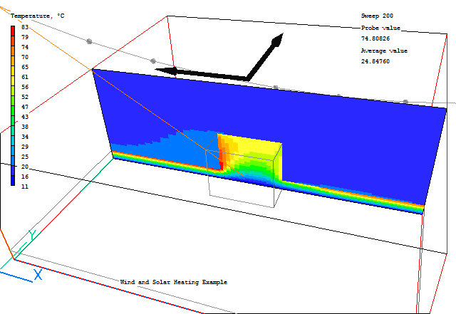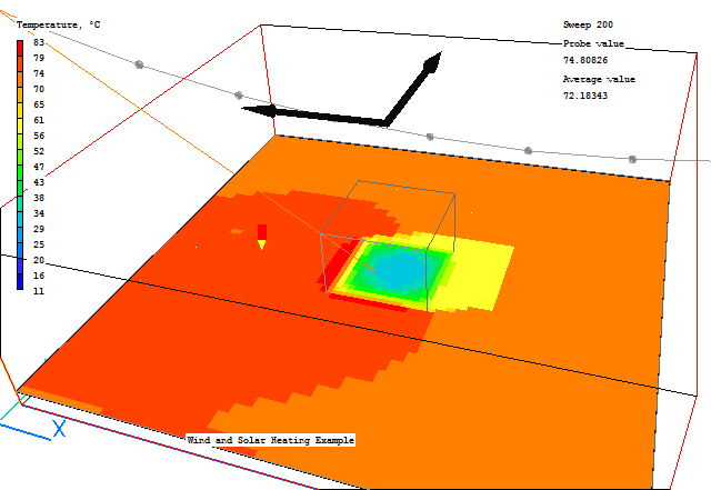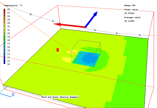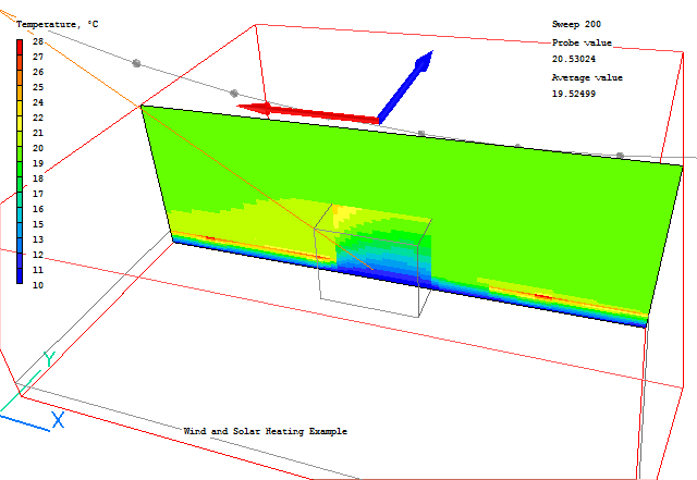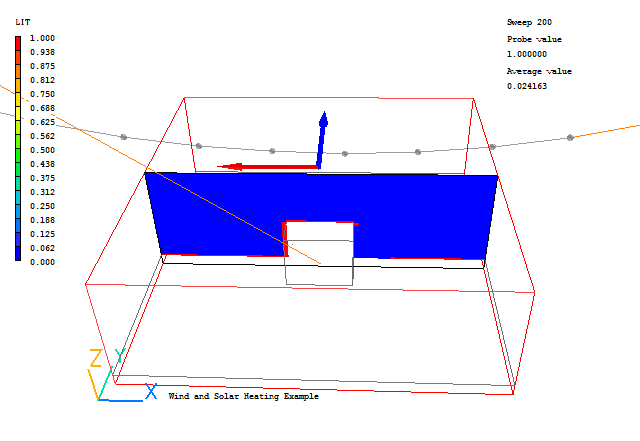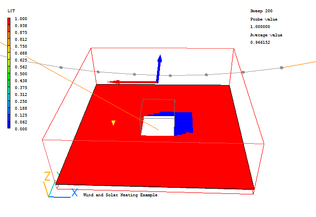 From these images we can see that the shadow is behind the building as expected. In the shadow zone, only the diffuse heating is applied. The heat load is applied in the first layer of cells inside the solids.