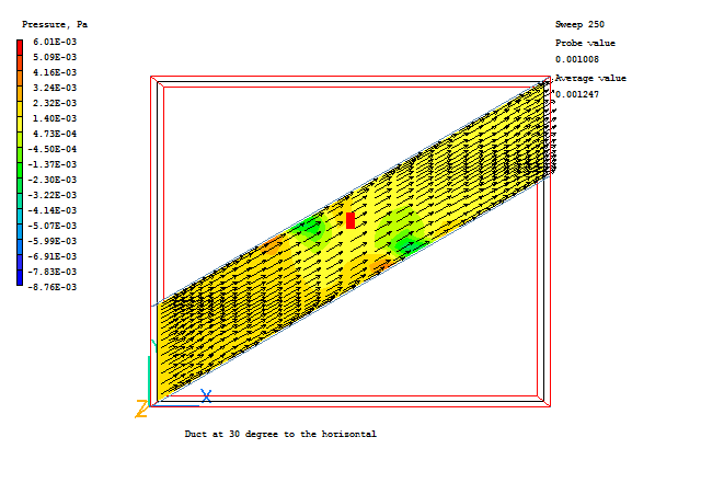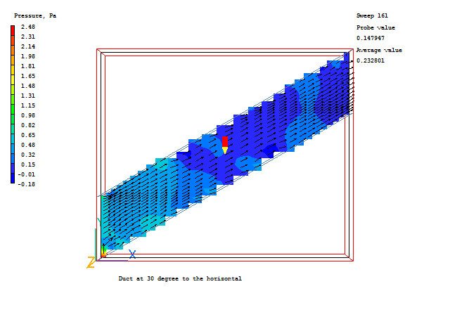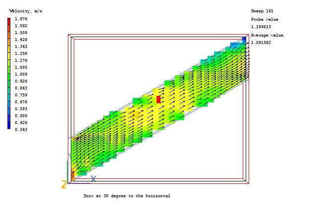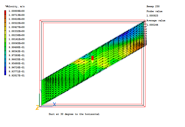 The flow enters at 1.0 m/s, again at 30° to the horizontal. There should hence be no velocity profile across the duct, and no pressure drop along it.